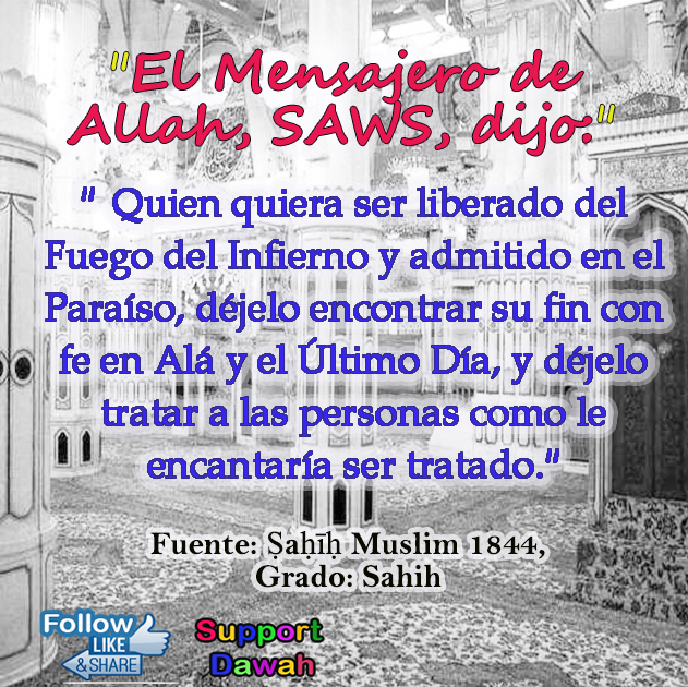 Quien quiera ser liberado del Fuego del Infierno y admitido en el Paraíso, déjelo encontrar su fin con fe en Alá y el Último Día, y déjelo tratar a las personas como le encantaría ser tratado.
