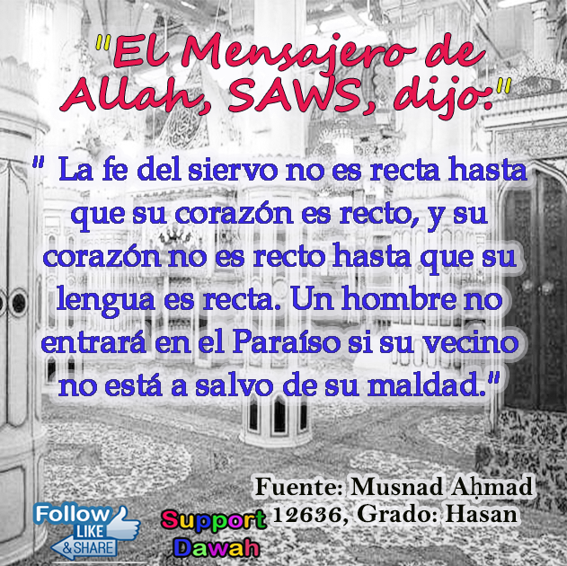 La fe del siervo no es recta hasta que su corazón es recto, y su corazón no es recto hasta que su lengua es recta. Un hombre no entrará en el Paraíso si su vecino no está a salvo de su maldad.