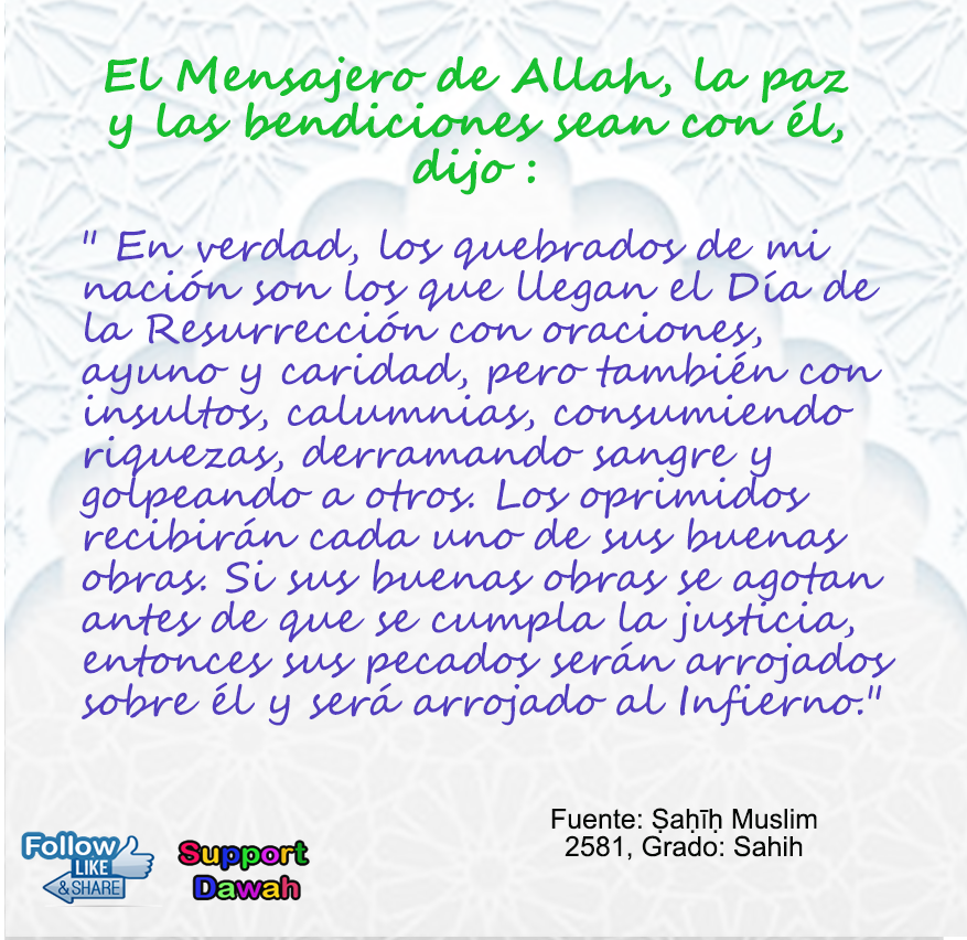 En verdad, los quebrados de mi nación son los que llegan el Día de la Resurrección con oraciones, ayuno y caridad, pero también con insultos, calumnias, consumiendo riquezas, derramando sangre y golpeando a otros. Los oprimidos recibirán cada uno de sus buenas obras. Si sus buenas obras se agotan antes de que se cumpla la justicia, entonces sus pecados serán arrojados sobre él y será arrojado al Infierno.