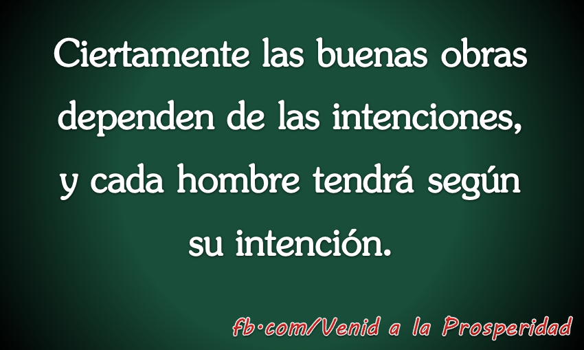 "Ciertamente las buenas obras dependen de las intenciones, y cada hombre tendrá según su intención; así, aquel cuya emigración fue por Dios y su Mensajero, su emigración fue por Dios y su Mensajero, y aquel cuya emigración fue por conseguir algún beneficio mundanal o por tomar alguna mujer en matrimonio, su emigración fue para aquello por lo que emigró".
