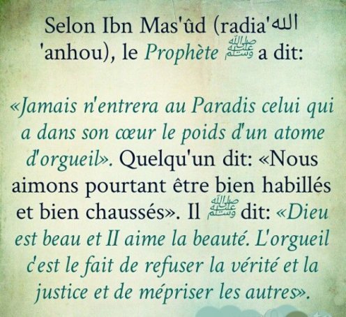Le Prophète ﷺ a dit: « N’entrera pas au Paradis celui qui a dans son cœur le poids d’un atome d’orgueil ». Un homme demanda : « Pourtant l’homme aime porter de beaux vêtements et de belles chaussures. » Le Prophète ﷺ reprit : « Allah est Beau et aime la beauté. L’orgueil est le fait de rejeter la vérité et de mépriser les gens. » [Muslim, riyad as-salihin n°612]