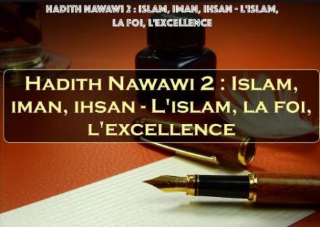 D’après ‘Omar - رضي الله عنه - qui a dit : Pendant que nous étions un jour assis chez le Prophète - صلى الله عليه و سلم - , apparut soudain parmi nous une certaine personne portant des habits tout blancs, ayant des cheveux très noirs ; aucune trace d’un long voyage ne paraissait sur lui et aucun parmi nous ne le connaissait. Il s’avança et s’assit près du Prophète - صلى الله عليه و سلم - . Il appuya ses genoux contre les siens, posa les paumes de ses deux mains sur ses deux cuisses et dit :