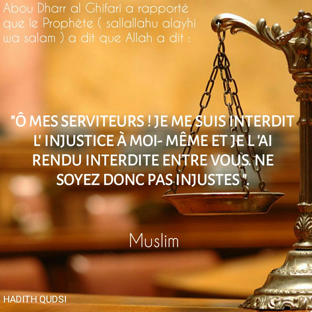 « Ô Mes serviteurs, Je me suis interdis l’injustice à Moi-même et je l’ai rendue interdite entre vous : Ne soyez donc pas injustes les uns envers les autres.