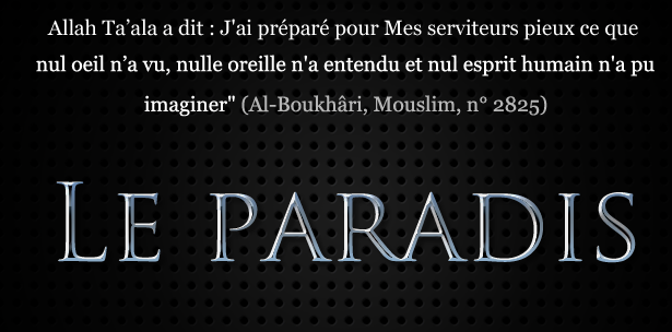 Allah a dit : J’ai préparé pour Mes serviteurs pieux, ce que nul oeil n’a vu et ce que nul oreille n’a entendu, ce qu’aucun coeur humain n’a ressenti. (Et ceci est attesté par la parole d’Allah suivante) : {Aucun être ne sait ce qu’on a réservé pour eux [les habitants du Paradis] comme réjouissance pour les yeux, en récompense de ce qu’ils oeuvraient} (Coran 32.17) [Al-Boukhari et Muslim]