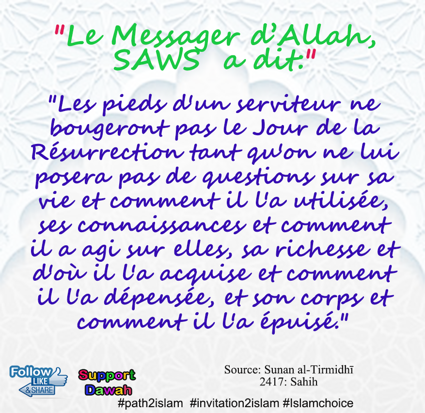 Les pieds d'un serviteur ne bougeront pas le Jour de la Résurrection tant qu'on ne lui posera pas de questions sur sa vie et comment il l'a utilisée, ses connaissances et comment il a agi sur elle, sa richesse et d'où il l'a acquise et comment il l'a dépensée, et son corps et comment il l'a épuisé.