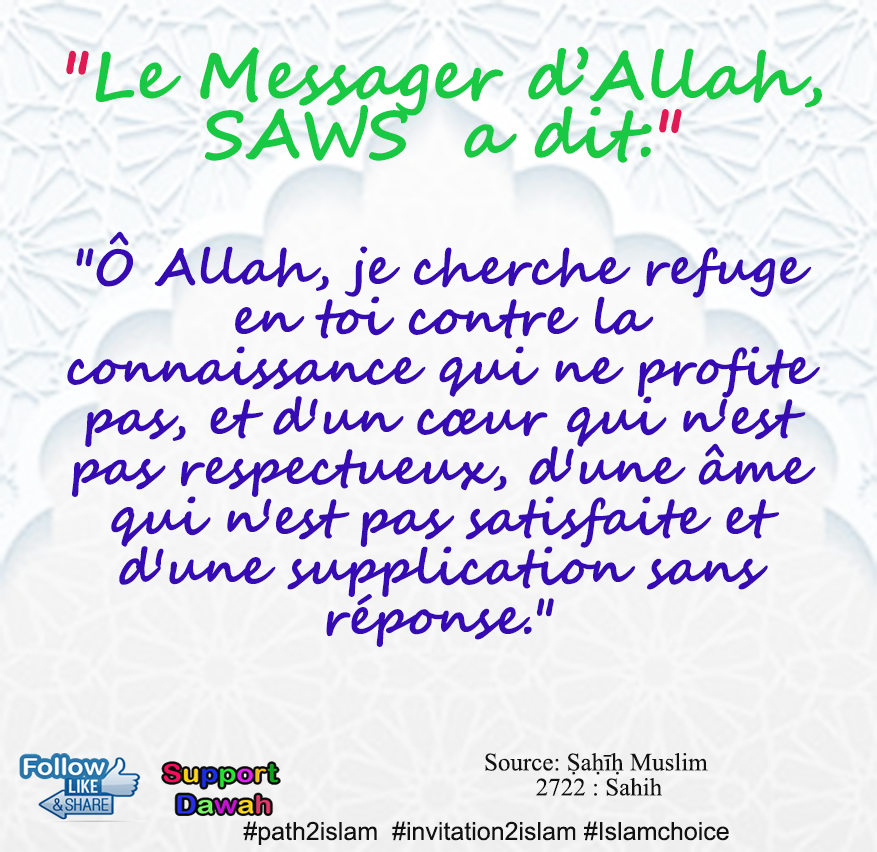 Ô Allah, je cherche refuge en toi contre la connaissance qui ne profite pas, d'un cœur qui n'est pas respectueux, d'une âme qui n'est pas contente et d'une supplication sans réponse.