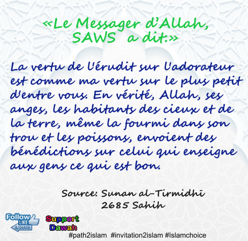 La vertu de l'érudit sur l'adorateur est comme ma vertu sur le plus petit d'entre vous. En vérité, Allah, ses anges, les habitants des cieux et de la terre, même la fourmi dans son trou et les poissons, envoient des bénédictions sur celui qui enseigne aux gens ce qui est bon.