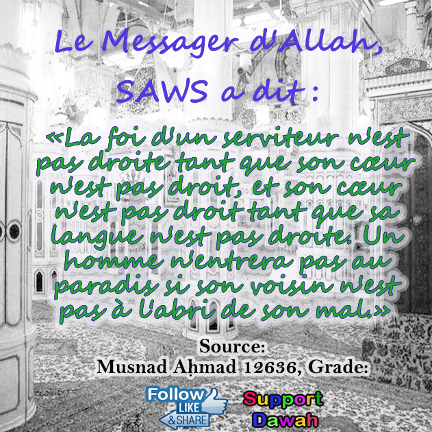 La foi d'un serviteur n'est pas droite tant que son cœur n'est pas droit, et son cœur n'est pas droit tant que sa langue n'est pas droite. Un homme n'entrera pas au paradis si son voisin n'est pas à l'abri de son mal.