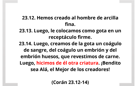 "Ciertamente que la creación de cada uno de vosotros, se reúne en el vientre de su madre: Durante cuarenta días en forma de un germen, luego es un coágulopor un período igual, después un pedazo de carne por un período igual y luego se le envía el angel que sopla el espiritu en él, y se le encomiendan cuatro palabras(asuntos): Escribir su sustento, el plazo de su vida, sus obras y si será feliz o desgraciado; ¡por Dios!, aparte de quien no hay otro dios, uno de vosotros obra como las gentes del Paraíso, hasta que no quede entre él y éste (paraíso) más que un brazo de distancia, entonces lo que ha sido escrito le alcanza, y obra como las gentes del fuego (Infierno) y entra en él. Y otro de vosotros obra como la gente del fuego (Infierno), hasta que no queda entre él y éste más que un brazo de distancia, y entonces le alcanza lo que ha sido escrito y obra como las gentes del Paraíso y entra en él".