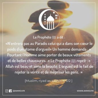 Le Prophète ﷺ a dit: « N’entrera pas au Paradis celui qui a dans son cœur le poids d’un atome d’orgueil ». Un homme demanda : « Pourtant l’homme aime porter de beaux vêtements et de belles chaussures. » Le Prophète ﷺ reprit : « Allah est Beau et aime la beauté. L’orgueil est le fait de rejeter la vérité et de mépriser les gens. » [Muslim, riyad as-salihin n°612]