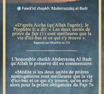 Le Messager d’Allah ﷺ a dit: « Celui qui accomplit la prière de l’aube (fajr) est sous la protection d’Allah. Faites en sorte qu’Allah ne vous demande pas de comptes au sujet de la protection qu’Il accorde, car celui à qui des comptes seront demandés, sera saisi pour être jeté la tête la première dans le feu de l’Enfer. » [Muslim, riyad as-salihin n°389]