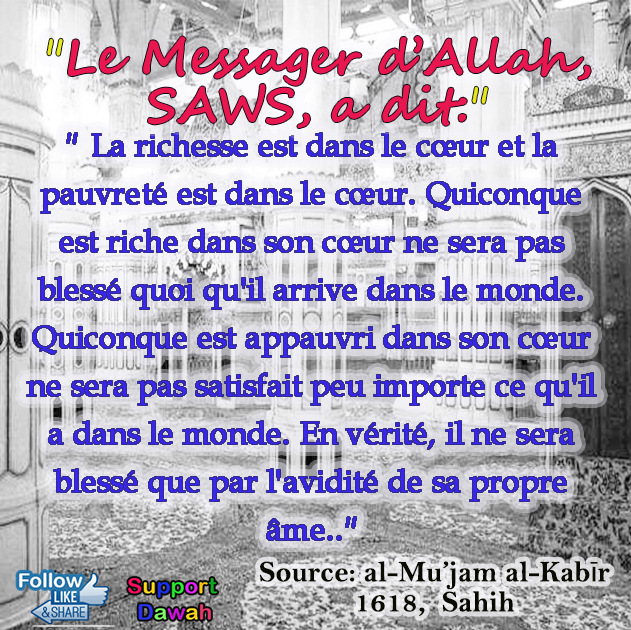 La richesse est dans le cœur et la pauvreté est dans le cœur. Quiconque est riche dans son cœur ne sera pas blessé quoi qu'il arrive dans le monde. Quiconque est appauvri dans son cœur ne sera pas satisfait peu importe ce qu'il a dans le monde. En vérité, il ne sera blessé que par l'avidité de sa propre âme.