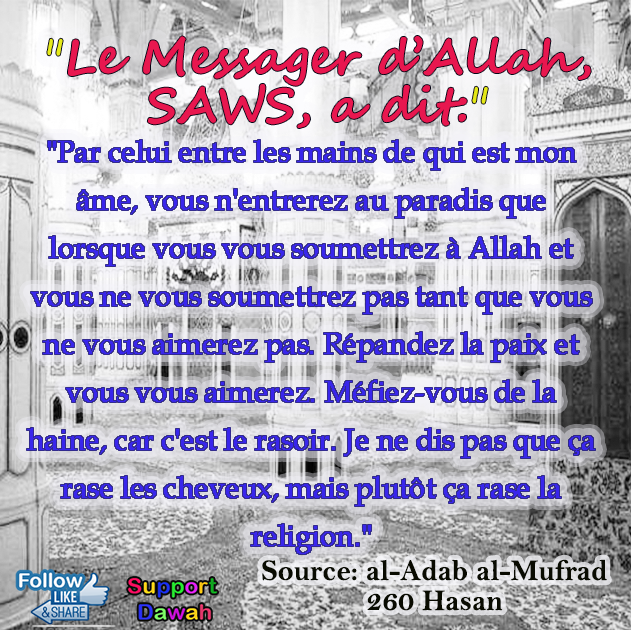 Par celui entre les mains de qui est mon âme, vous n'entrerez au paradis que lorsque vous vous soumettrez à Allah et vous ne vous soumettrez pas tant que vous ne vous aimerez pas. Répandez la paix et vous vous aimerez. Méfiez-vous de la haine, car c'est le rasoir. Je ne dis pas que ça rase les cheveux, mais plutôt ça rase la religion.