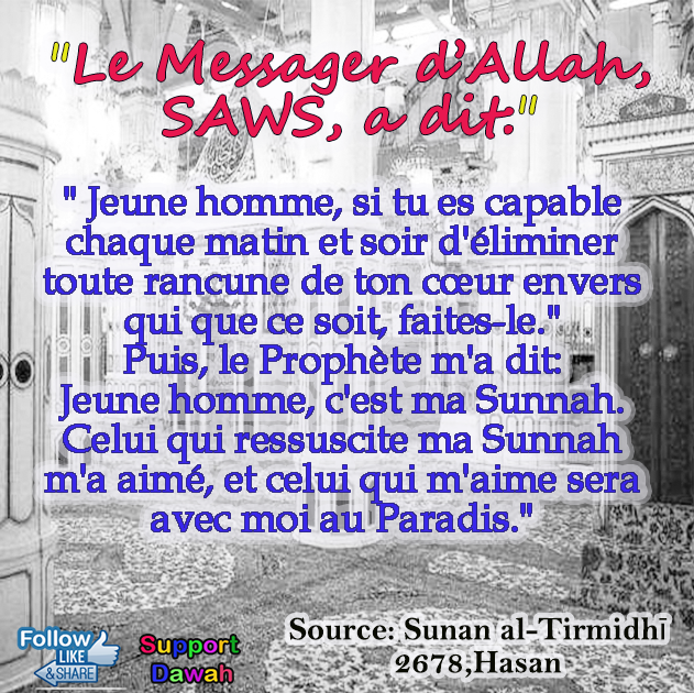 Jeune homme, c'est ma Sunnah. Celui qui ressuscite ma Sunna m'a aimé, et celui qui m'aime sera avec moi au Paradis.
