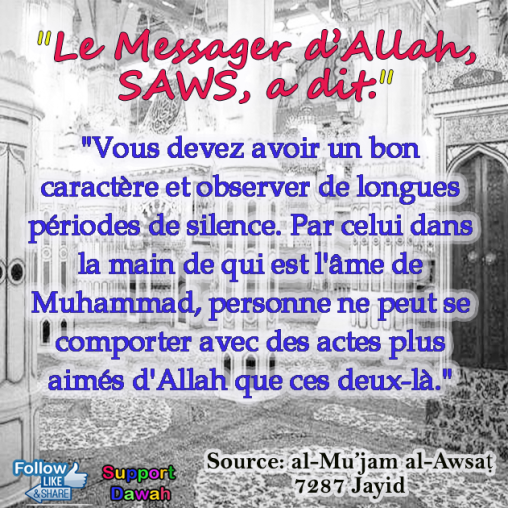 Vous devez avoir un bon caractère et observer de longues périodes de silence. Par celui dans la main de qui est l'âme de Muhammad, personne ne peut se comporter avec des actes plus aimés d'Allah que ces deux-là.