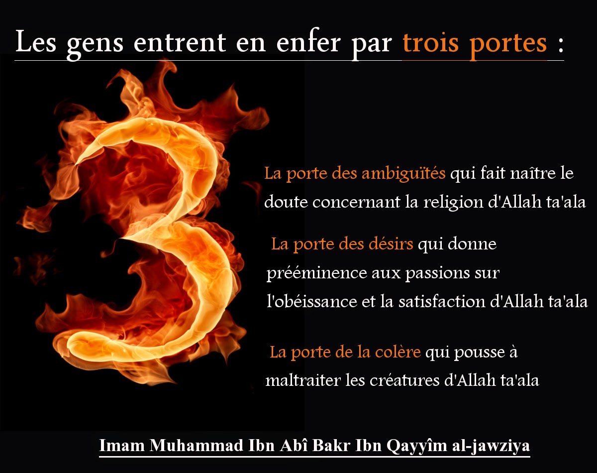 Allah dit alors: “Va contempler l’Enfer et regarde ce que j’y ai préparé pour ses habitants!” Lorsque Jibril revint, il déclara: “Je jure par Ta Suprême Majesté – Ô Allah – que nul n’en entendra parler puis y entrera…” Allah ordonna alors que l’Enfer soit entouré de plaisirs et ordonna à Jibril de retourner le contempler; celui-ci déclara à son retour: “Par Ta Suprême Majesté – Ô Allah, je crains que personne n’en réchappe!” [At-Tirmidhi, authentifié par sheikh al Albani]