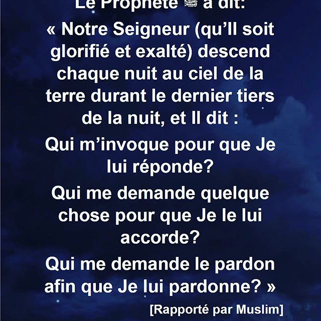 Notre Seigneur (qu’Il soit glorifié et exalté) descend chaque nuit au ciel de la terre durant le dernier tiers de la nuit, et Il dit : Qui m’invoque pour que Je lui réponde ? Qui me demande quelque chose pour que Je lui accorde ? Qui me demande le pardon afin que Je lui pardonne ? [Al-Boukhari et Muslim]