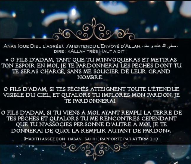 Allah Tout-Puissant dit : Ô fils d’Adam, aussi longtemps que tu M’appelleras et que tu Me prieras, Je te pardonnerai pour ce que tu as fait, et Je ne t’en tiendrais pas rigueur. Ô fils d’Adam, même si tes péchés devait atteindre les nuages du ciel, et que tu Me demanderais alors pardon, Je te pardonnerai. Ô fils d’Adam, même si tu venais à Moi avec des péchés aussi grands que la terre et que tu te présenterais alors à Moi, sans M’attribuer aucun associé, Je t’accorderai un pardon aussi grand. [At-tirmidhi, authentifié par sheikh al Albani]