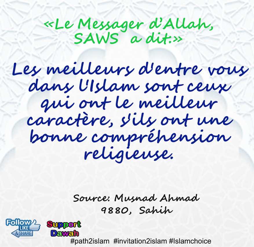 Les meilleurs d'entre vous dans l'Islam sont ceux qui ont le meilleur caractère, s'ils ont une compréhension religieuse.