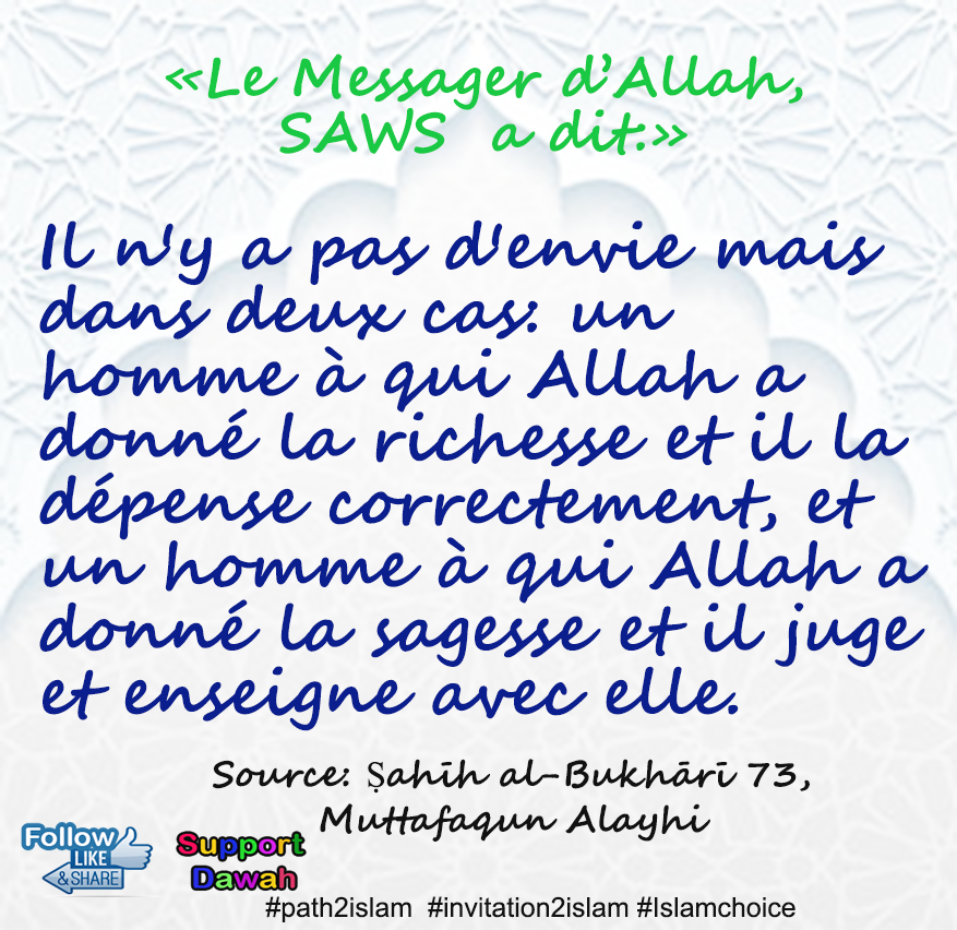 Il n'y a pas d'envie mais dans deux cas: un homme à qui Allah a donné la richesse et il la dépense correctement, et un homme à qui Allah a donné la sagesse et il juge et enseigne avec elle.