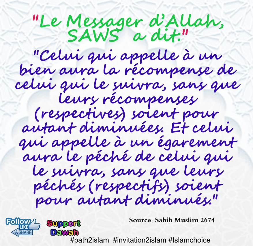 « Celui qui appelle à un bien aura la récompense de celui qui le suivra, sans que leurs récompenses (respectives) soient pour autant diminuées. Et celui qui appelle à un égarement aura le péché de celui qui le suivra, sans que leurs péchés (respectifs) soient pour autant diminués. »
