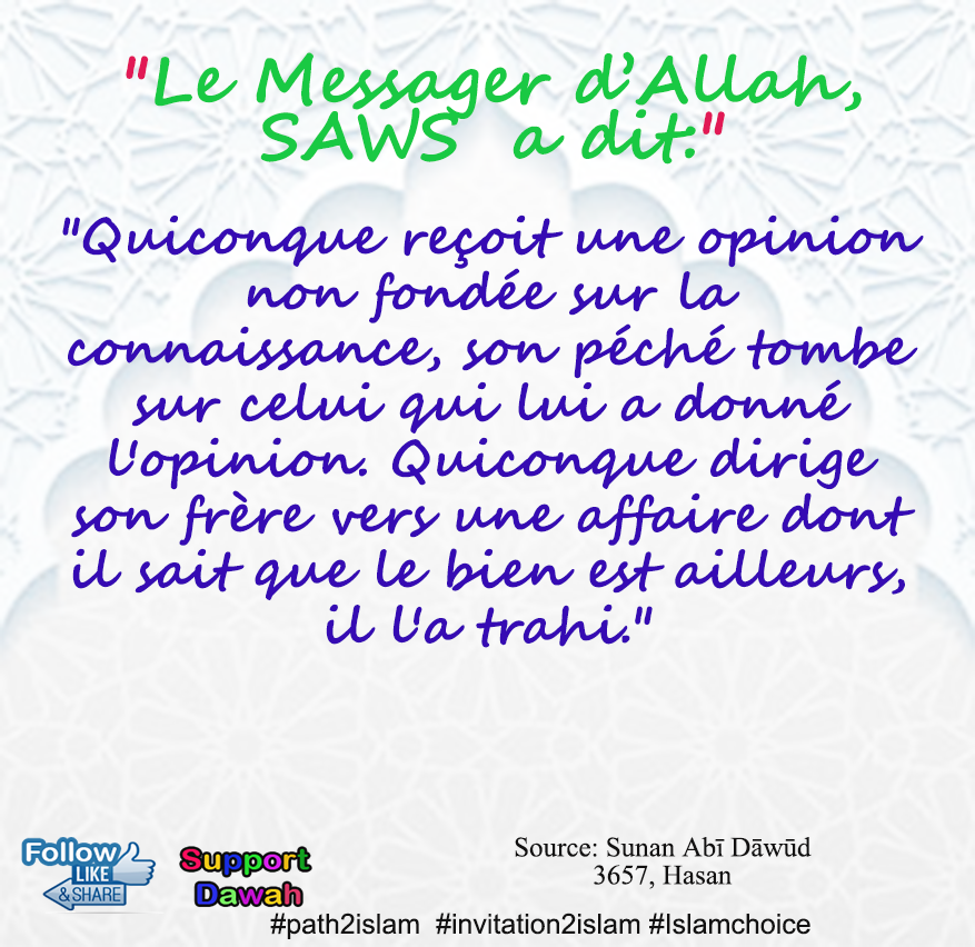 Quiconque reçoit une opinion non fondée sur la connaissance, son péché tombe sur celui qui lui a donné l'opinion. Quiconque dirige son frère vers une affaire dont il sait que le bien est ailleurs, il l'a trahi.