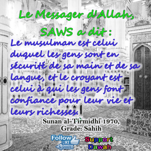 Le musulman est celui duquel les gens sont en sécurité de sa main et de sa langue, et le croyant est celui à qui les gens font confiance pour leur vie et leurs richesses.
