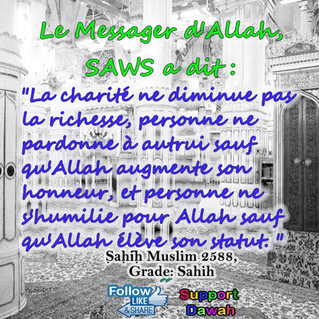 La charité ne diminue pas la richesse, personne ne pardonne à autrui sauf qu'Allah augmente son honneur, et personne ne s'humilie pour Allah sauf qu'Allah élève son statut.
