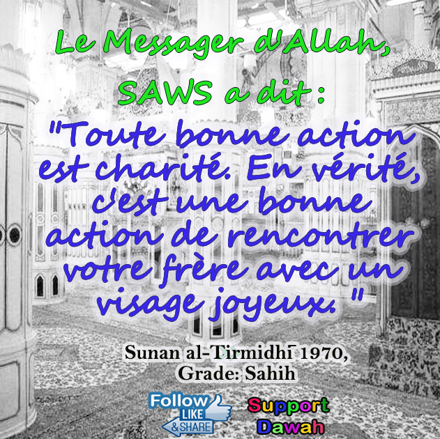 Toute bonne action est charité. En vérité, c'est une bonne action de rencontrer votre frère avec un visage joyeux.